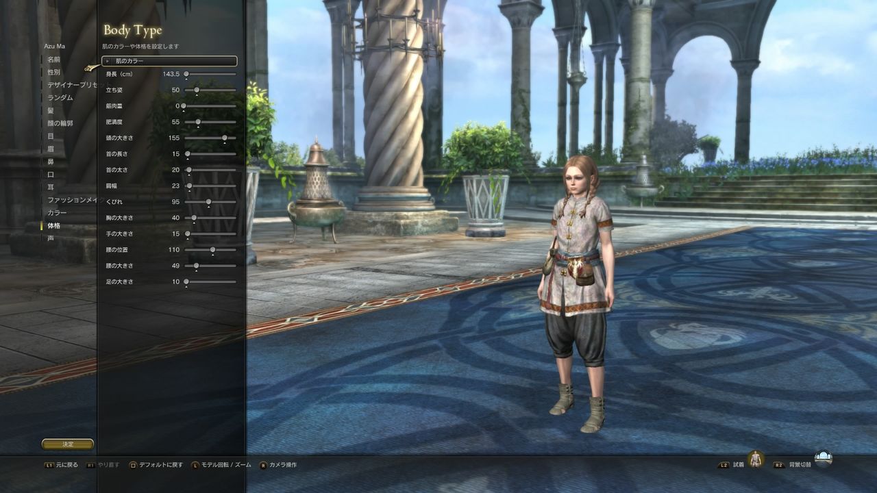 体格:身長(cm)143.5/立ち姿50/筋肉量0/肥満度55/頭の大きさ155/