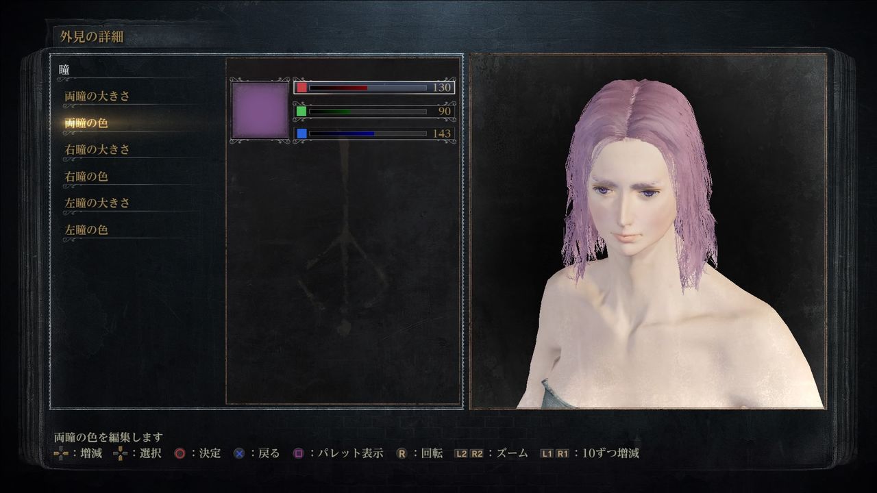両瞳の色(Color of Pupils):赤130/緑90/青143。好みの色で良い。