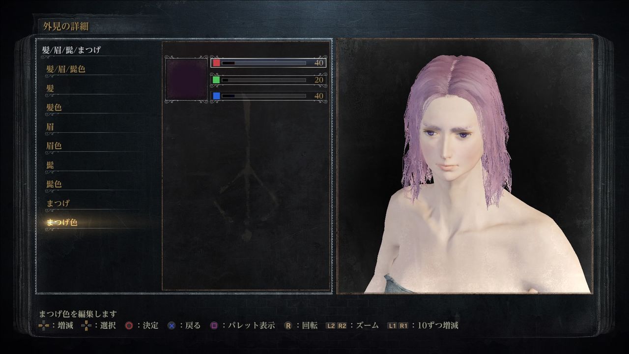 まつげ色(Eyelash Color):赤40/緑20/青40。好みの色で良い。