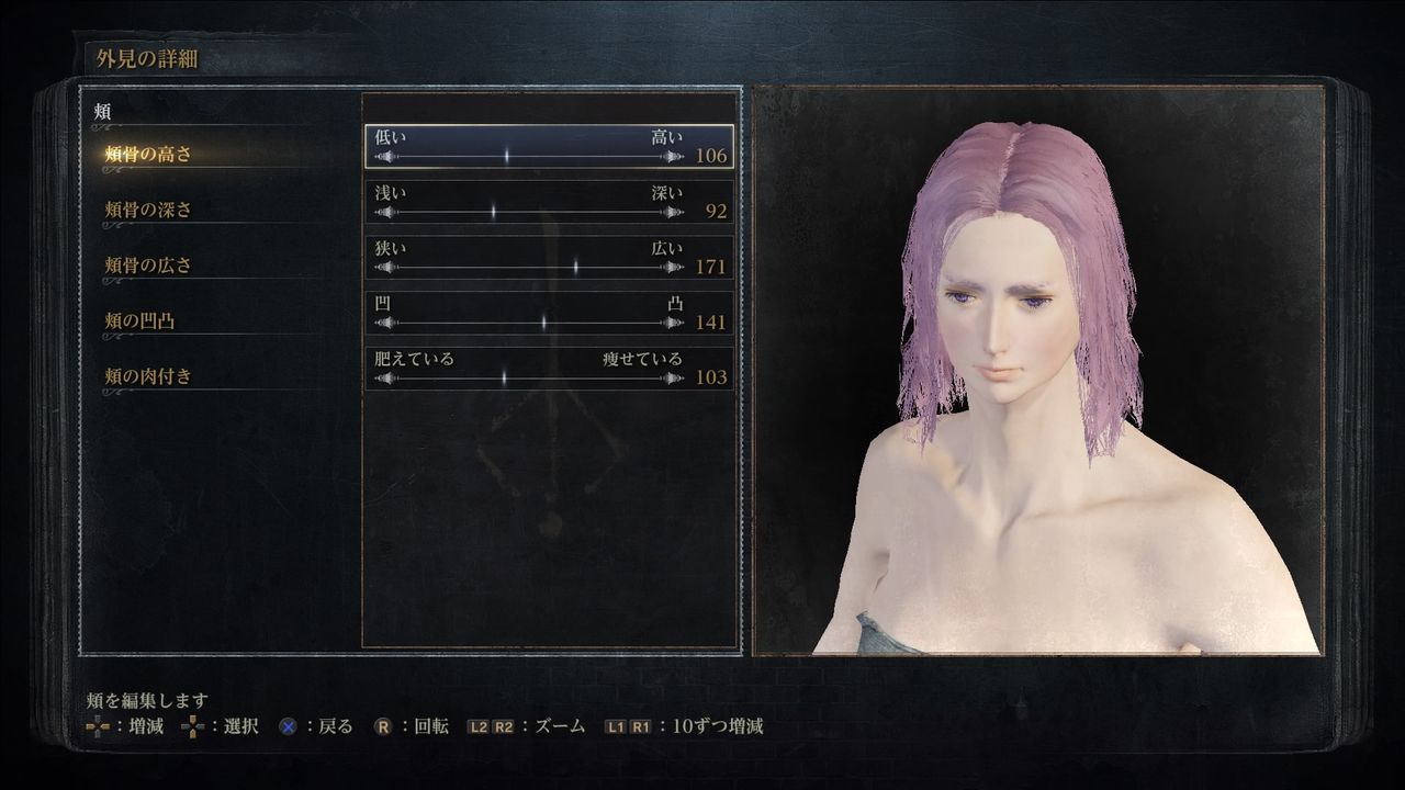 頬(Cheeks):高さ106/深さ92/広さ171/凹凸141/肉付き103