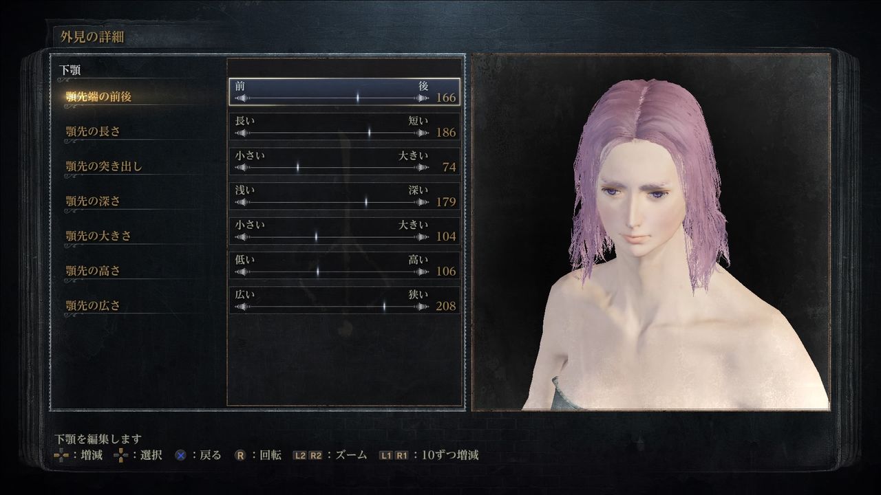 下顎(Chin):前後166/長さ186/突き出し74/深さ179/大きさ104/高さ106/