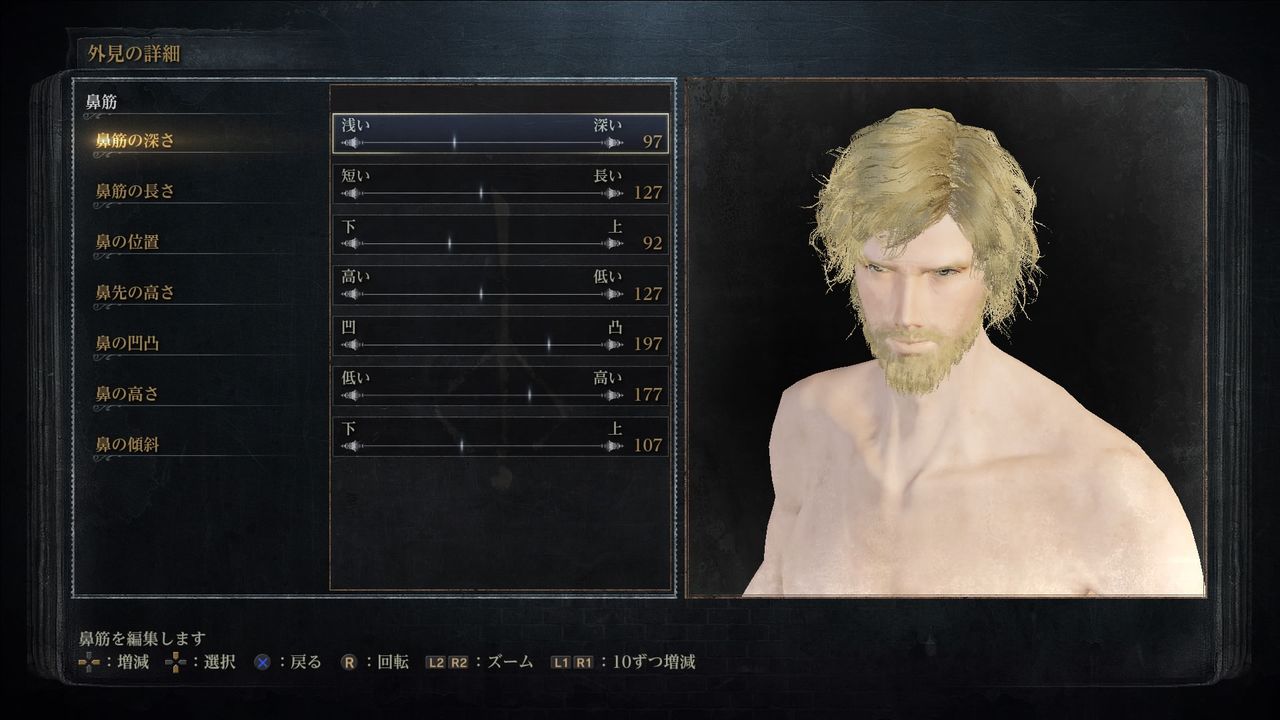 鼻筋(Nose Ridge):深さ97/長さ127/位置92/鼻先の高さ127/凹凸197/