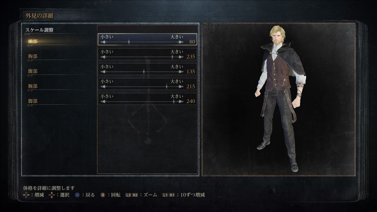 スケール調整(Scale Adjustment):頭部80/胸部235/腹部135/腕部215/