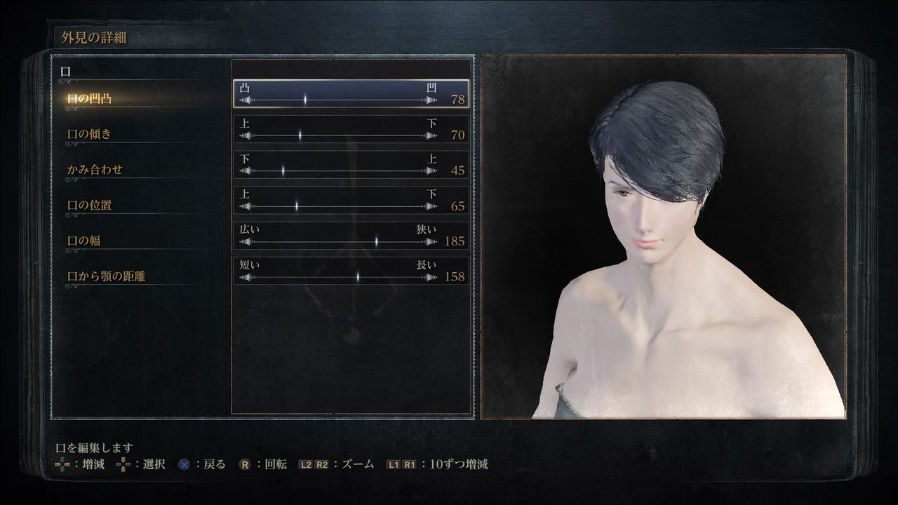 口(Mouth):凹凸78/傾き70/かみ合わせ45/位置65/幅185/顎の距離158