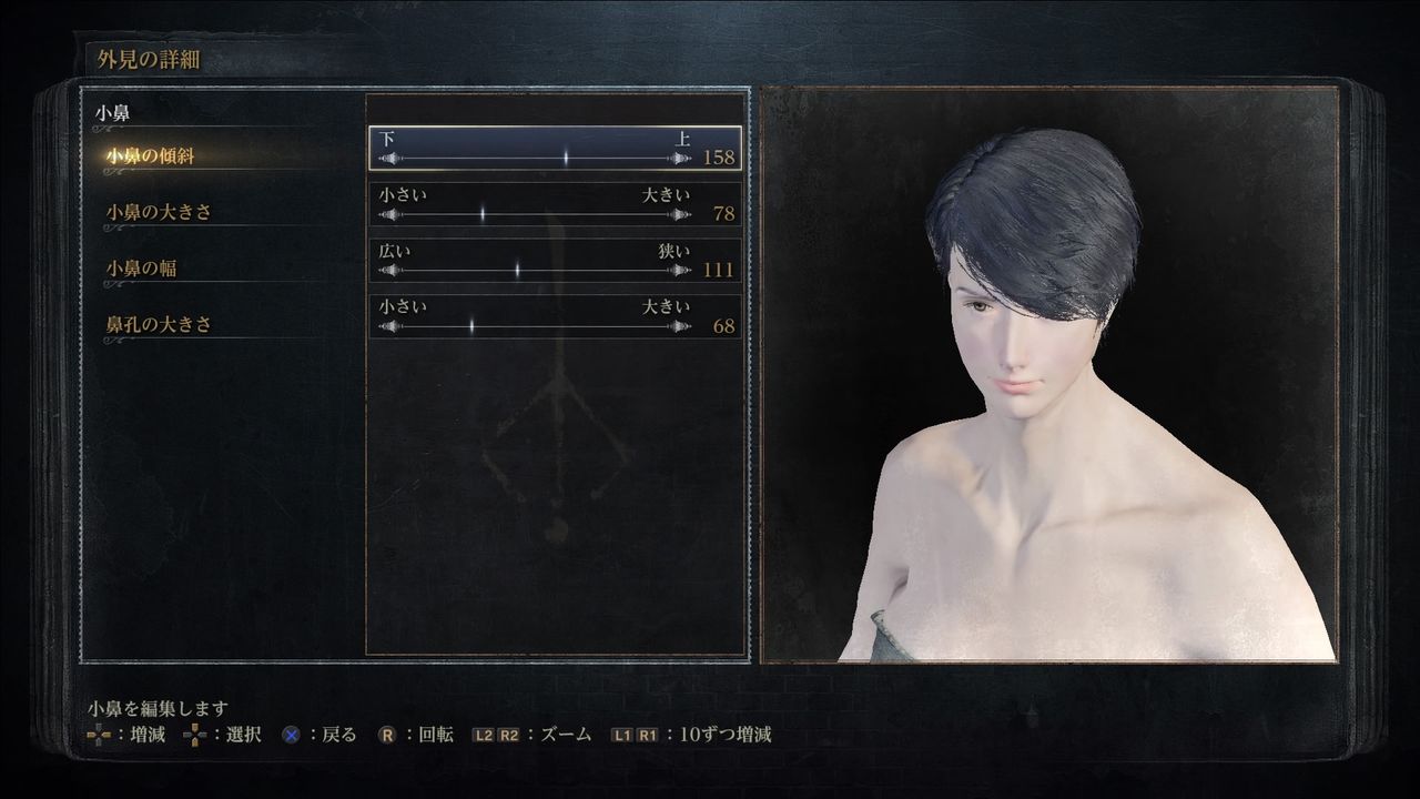 小鼻(Nostrils):傾斜158/小鼻の大きさ78/幅111/鼻孔の大きさ68