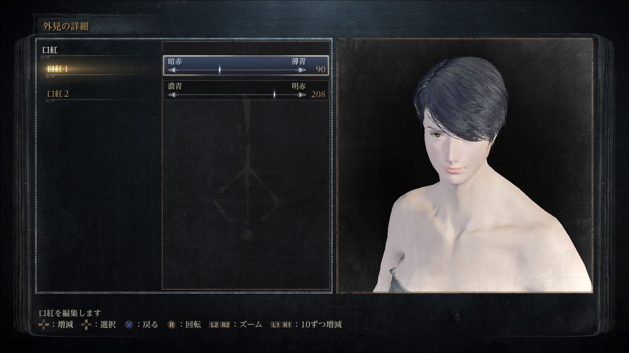 口紅(Lipstick):口紅①90/口紅②208。口紅①のみを50~120間で動かすと手軽に赤みを調整できる。好みの濃さで良い。