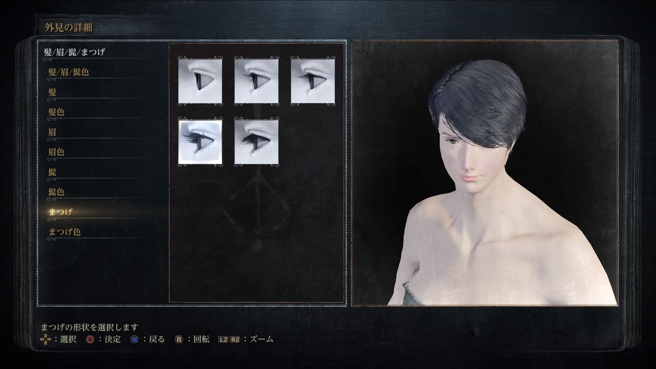 まつげ(Eyelashes):下段、左(x[■□ ],y↓-1)。上段のまつげは、男性っぽくなるため似合わない。