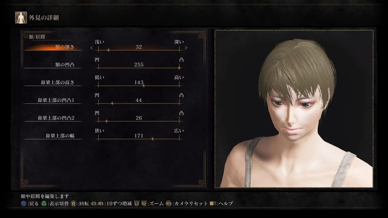 額/眉間(Forehead/Glabella):額の深さ32/額の凹凸255/
