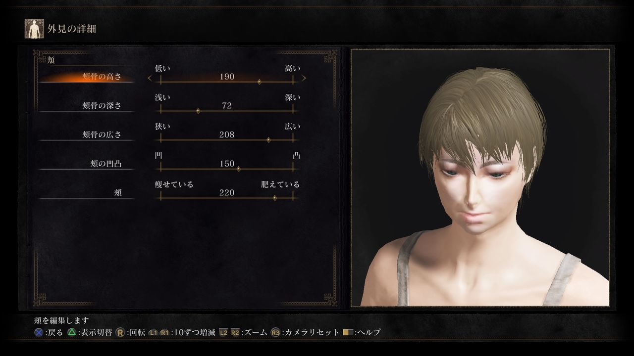 頬(Cheeks):頬骨の高さ190/頬骨の深さ72/頬骨の広さ208/頬の凹凸150/頬220
