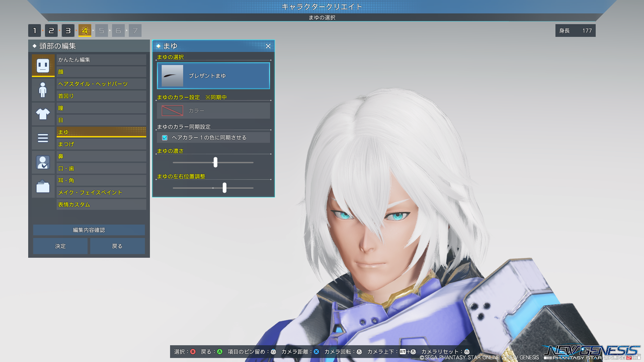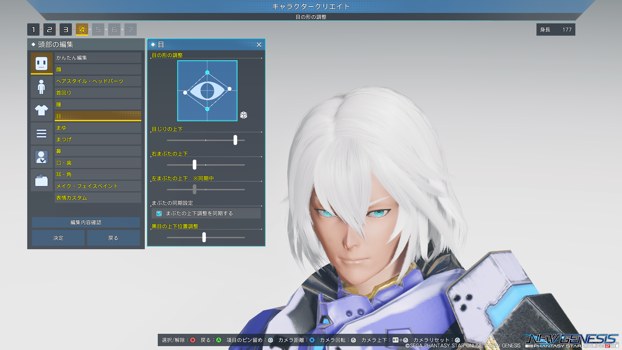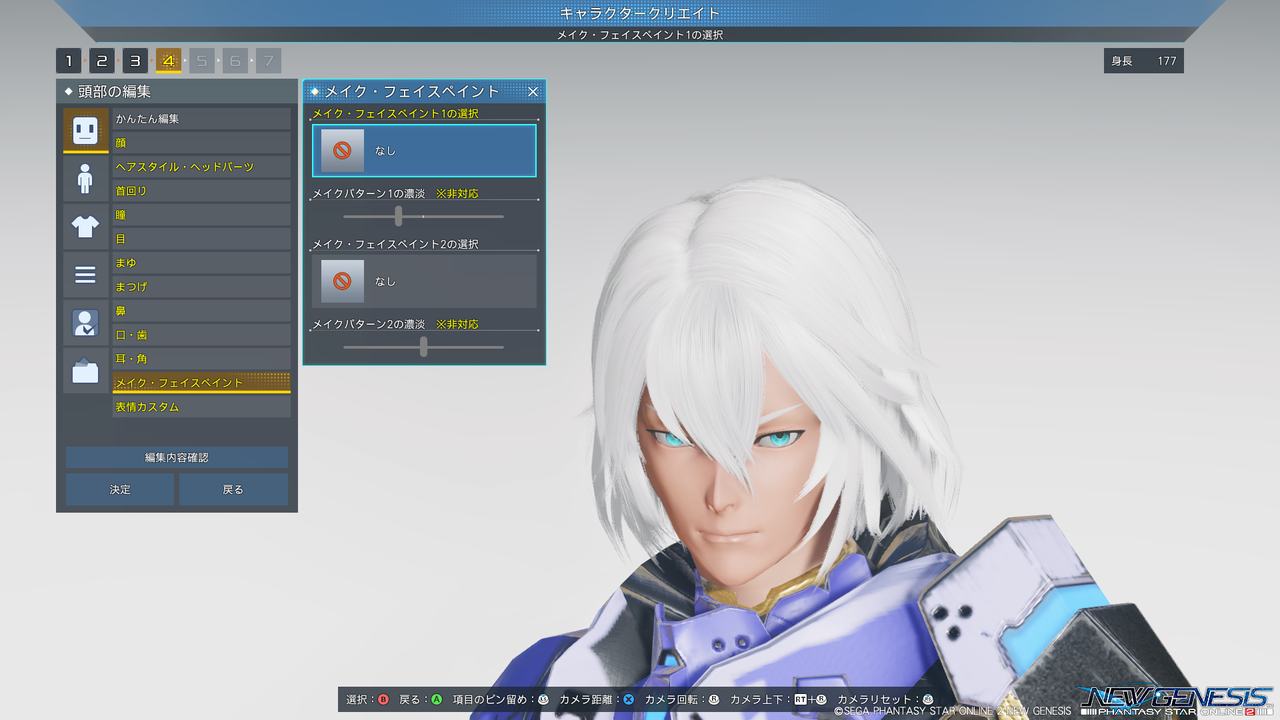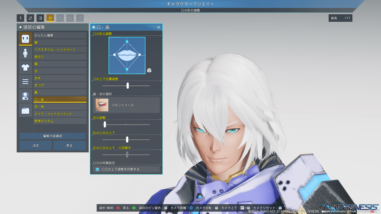 顔の形の調整:[1:↑max・2:→max・3:↓max]⇒[1:↓56click・2:←47click・3:↑58click]