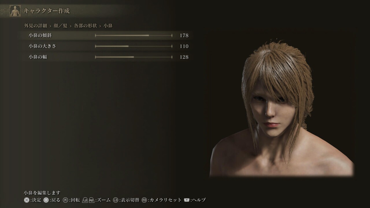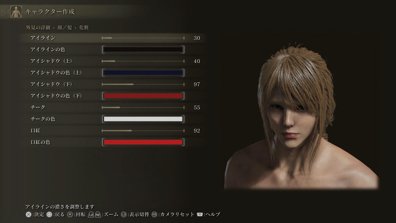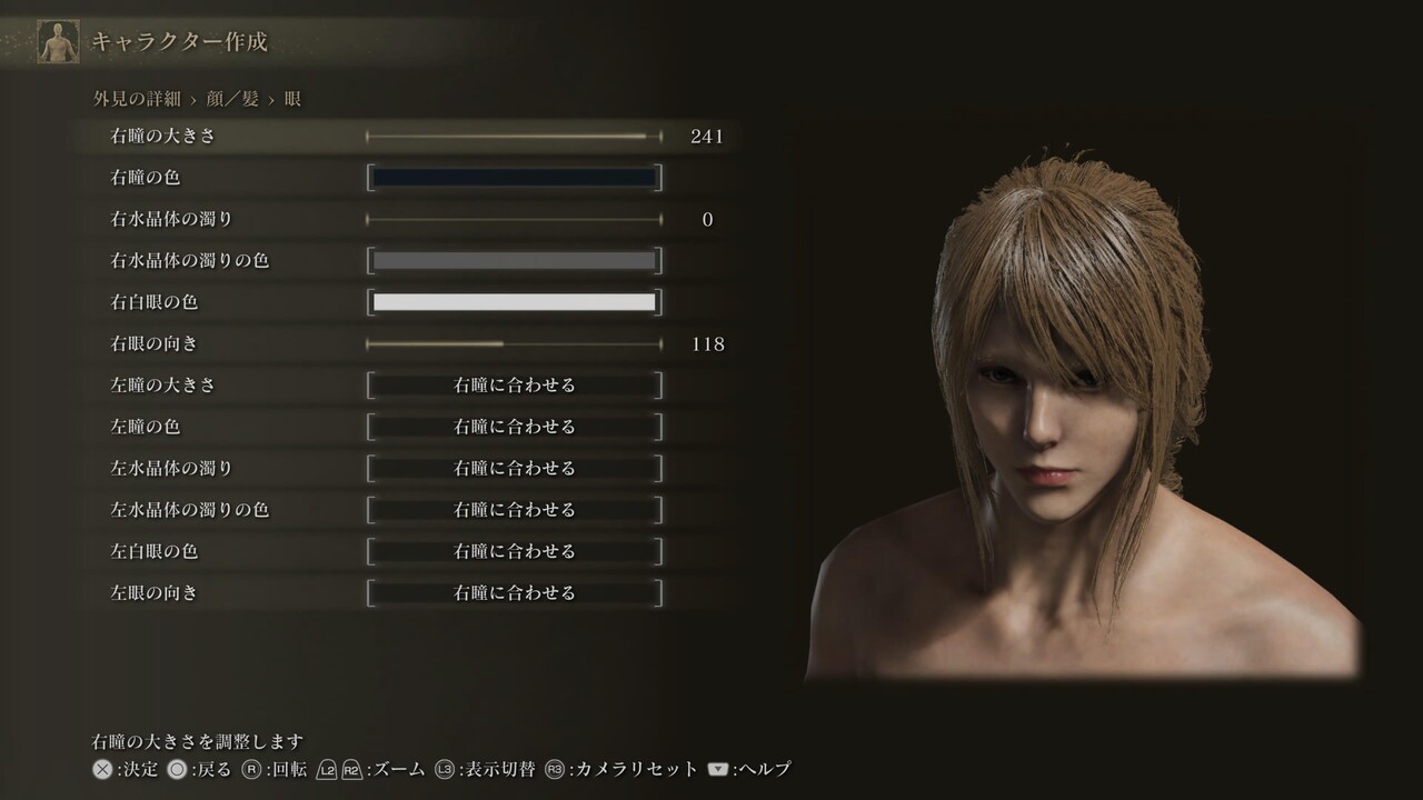 声、体のスケールや体毛、筋肉量は設定していないため自由。肌色、髪、眉、髭、まつげ、入れ墨/痣/眼帯も自由。眼、肌の特徴、化粧は、調整しても問題ないが、顔の印象が大きく変わる可能性がある。眼の項目にあるのままの設定になっているため、好みで調整しても良い。
