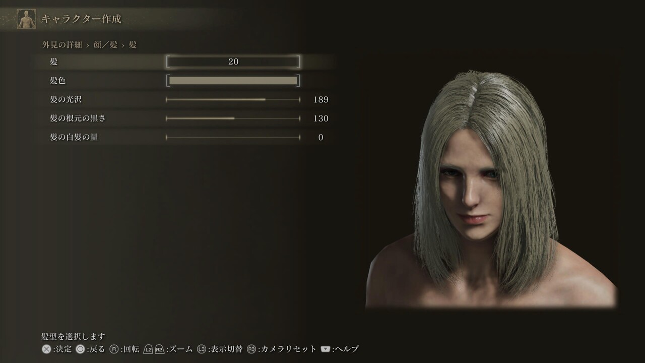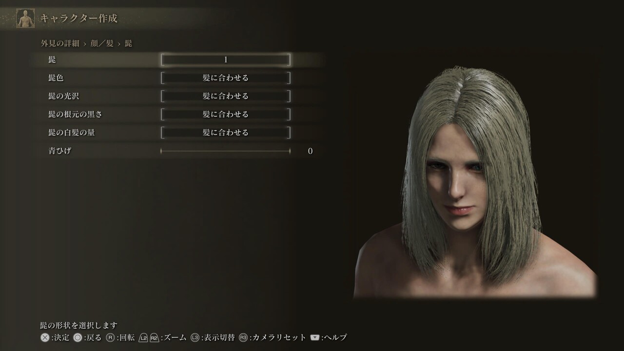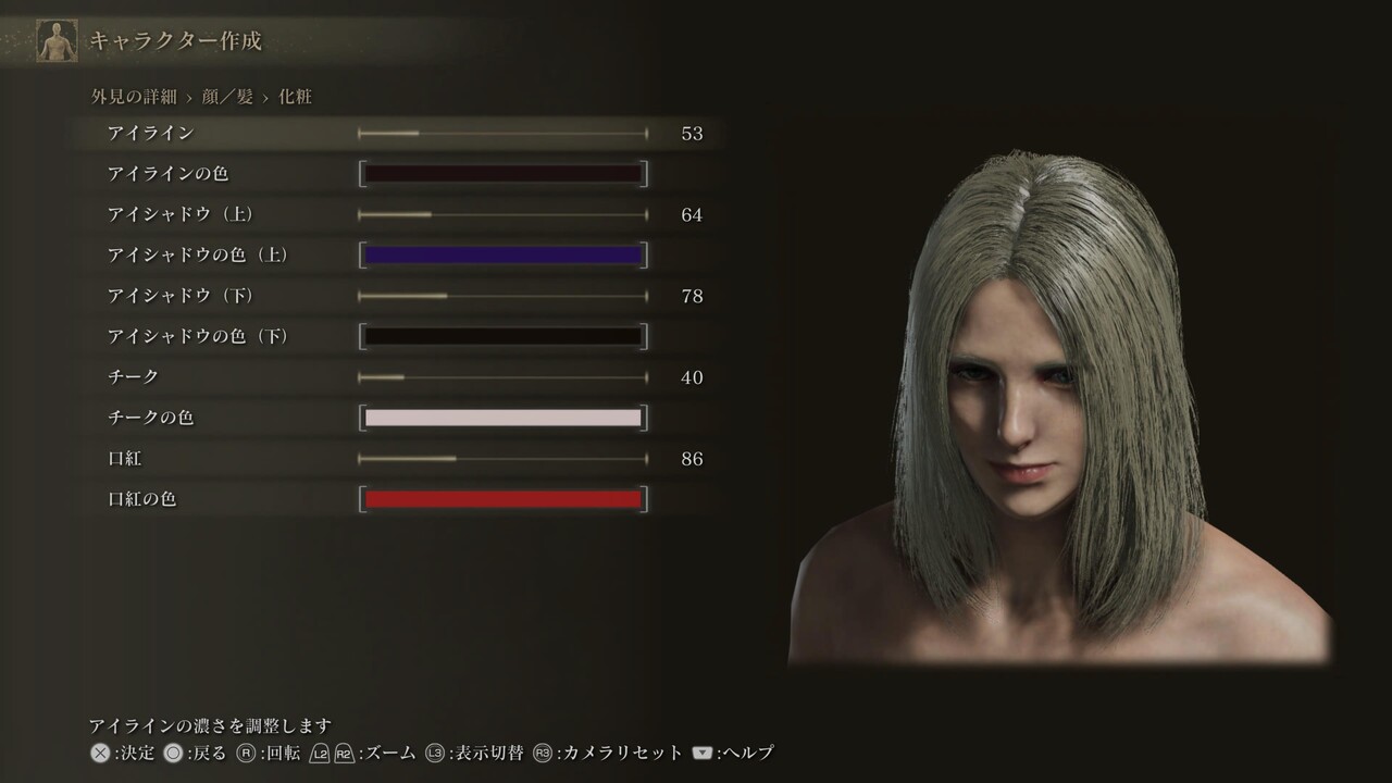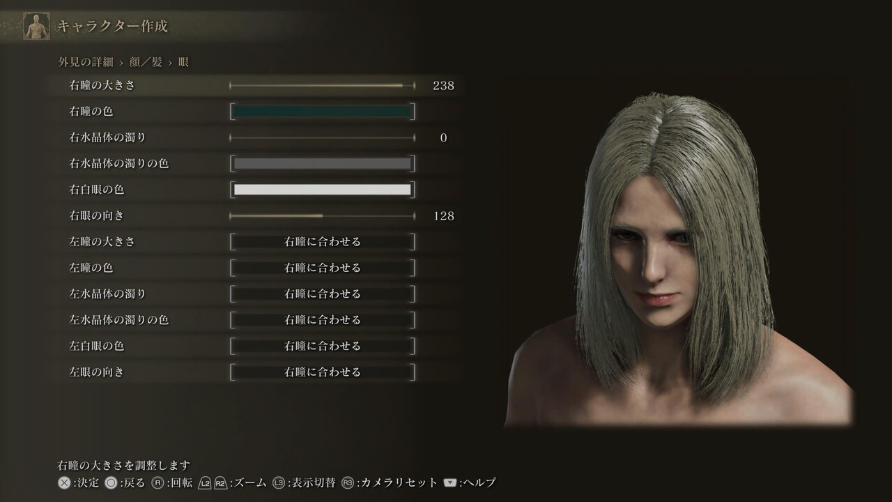 ※白眼の色、まつげ色、くまの色は初期値(255,255,255、0,0,0、20,30,25)。眉、髭にある、色に関する4項目は基本的に「髪に合わせる」設定になっている。