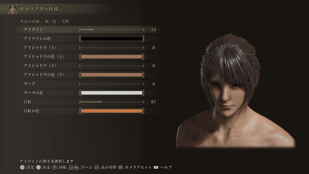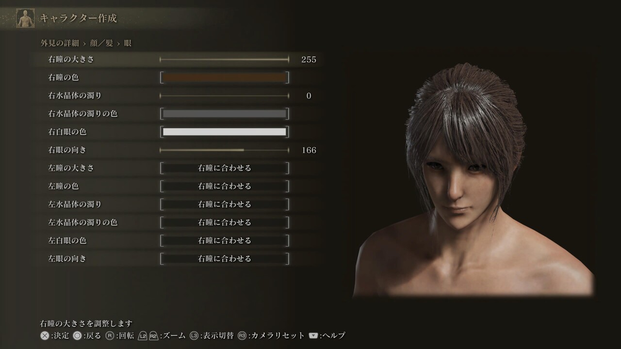 ※白眼の色、まつげ色、くまの色は初期値(255,255,255、0,0,0、20,30,25)。眉、髭にある、色に関する4項目は基本的に「髪に合わせる」設定になっている。