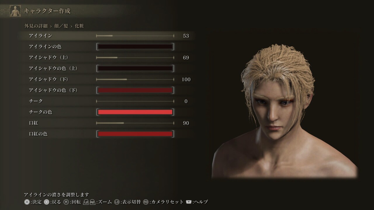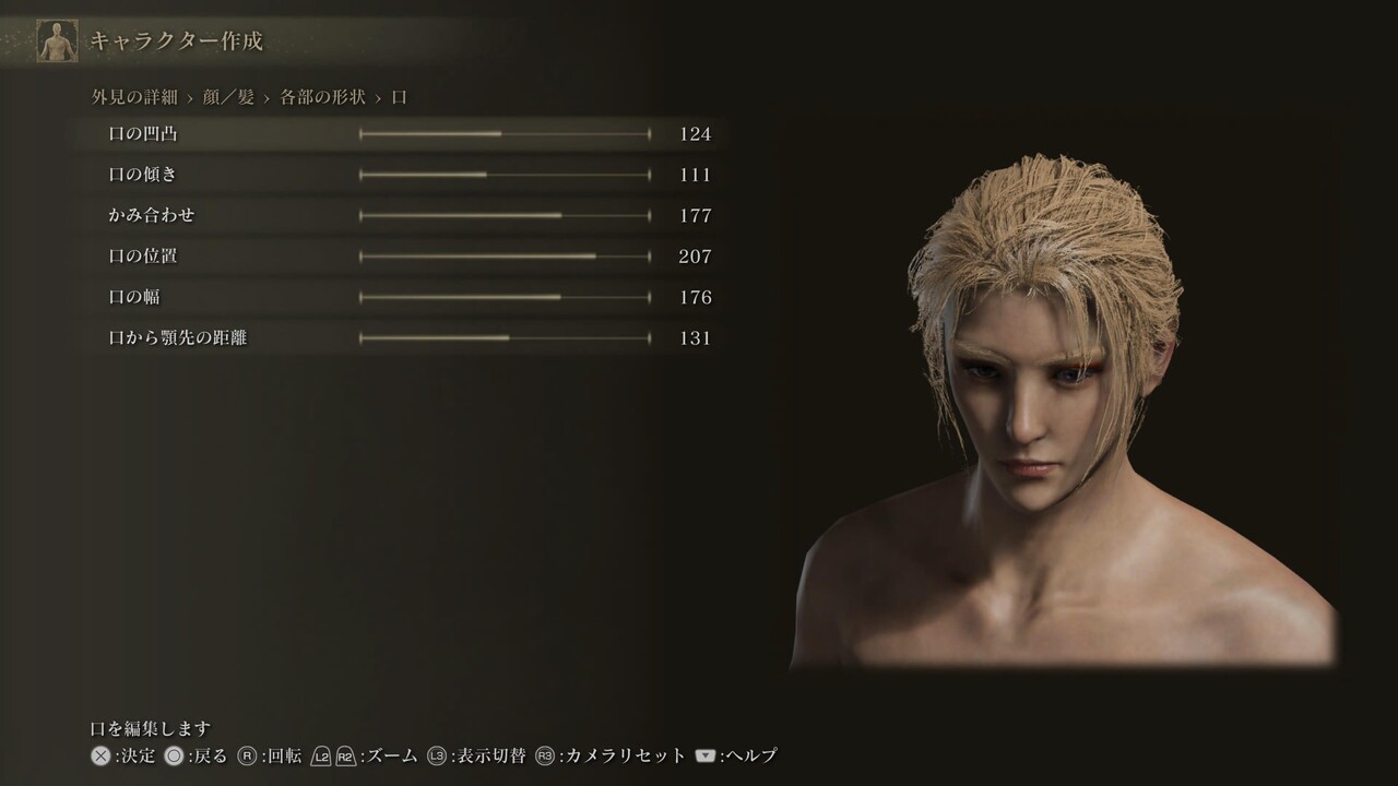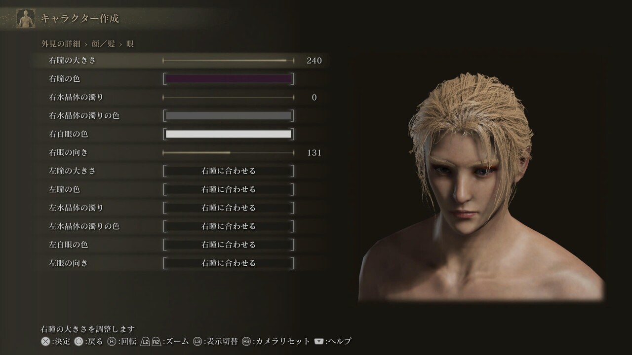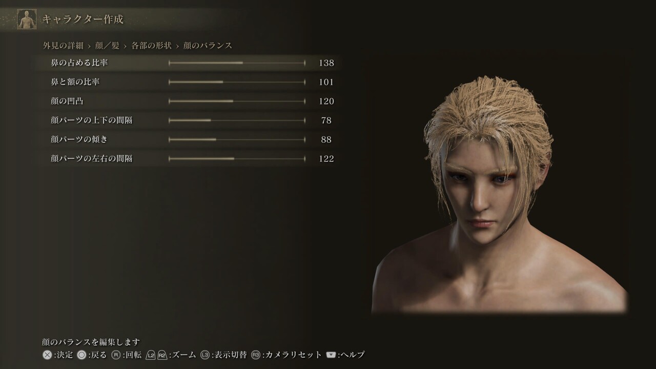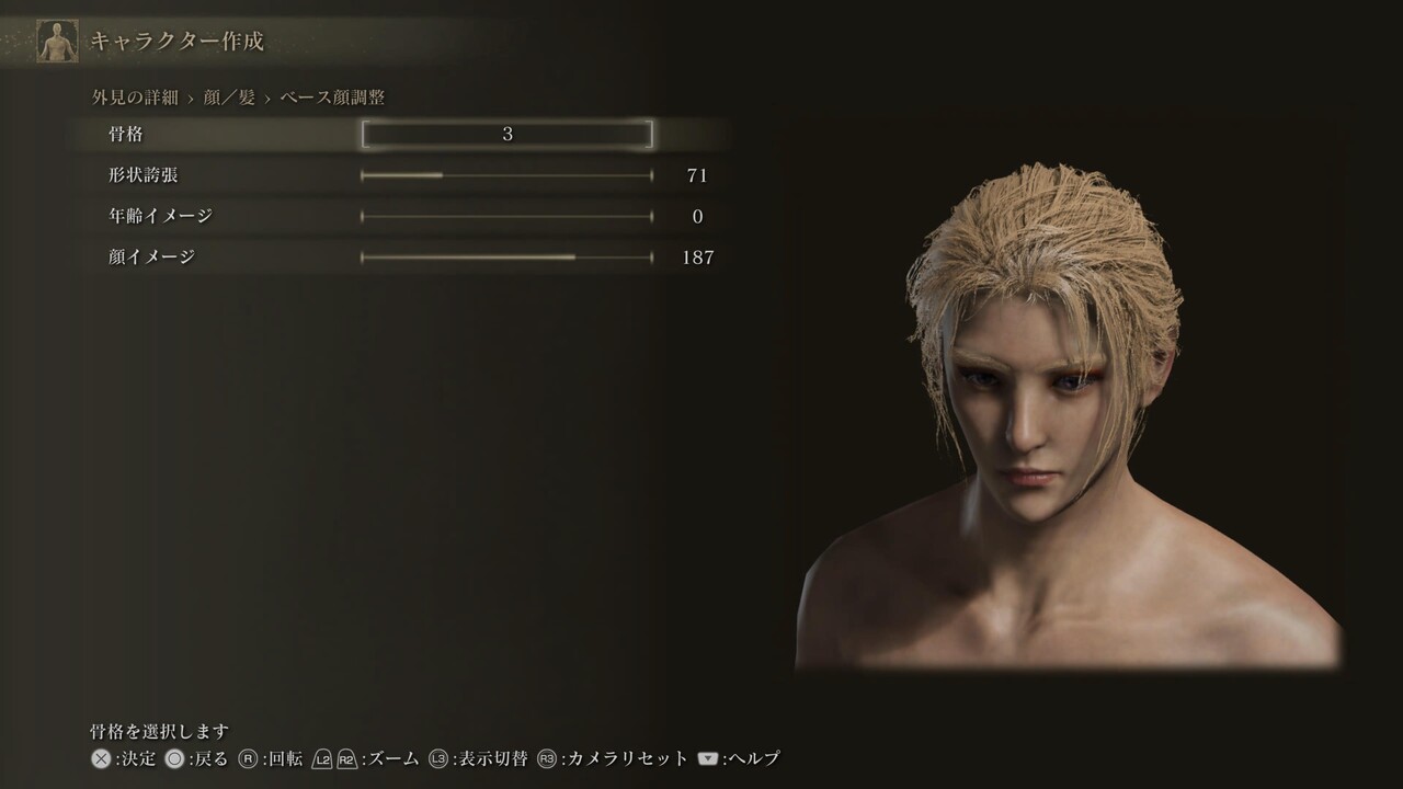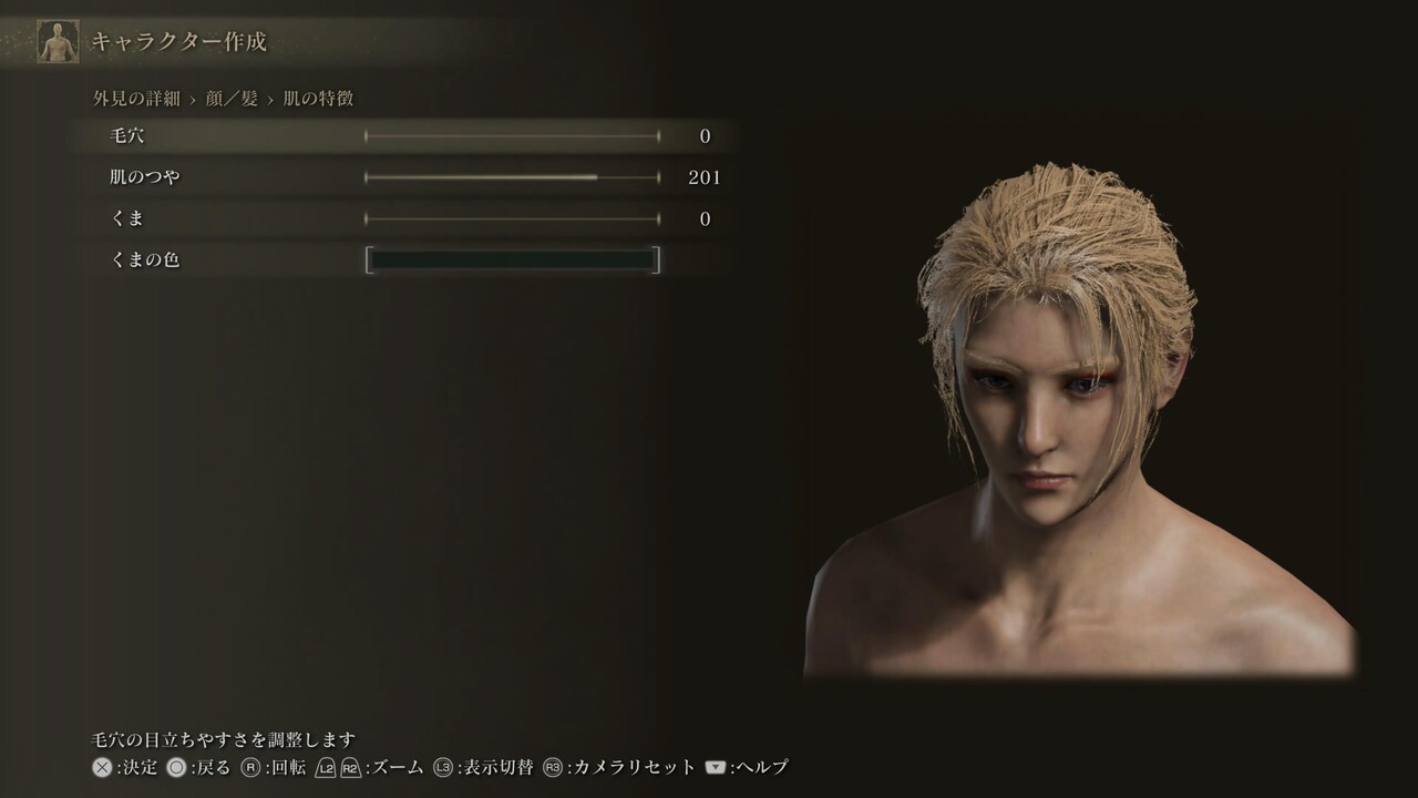 声、体のスケールや体毛、筋肉量は設定していないため自由。肌色、髪、眉、髭、まつげ、入れ墨/痣/眼帯も自由。眼、肌の特徴、化粧は、調整しても問題ないが、顔の印象が大きく変わる可能性がある。眼の項目にあるのままの設定になっているため、好みで調整しても良い。