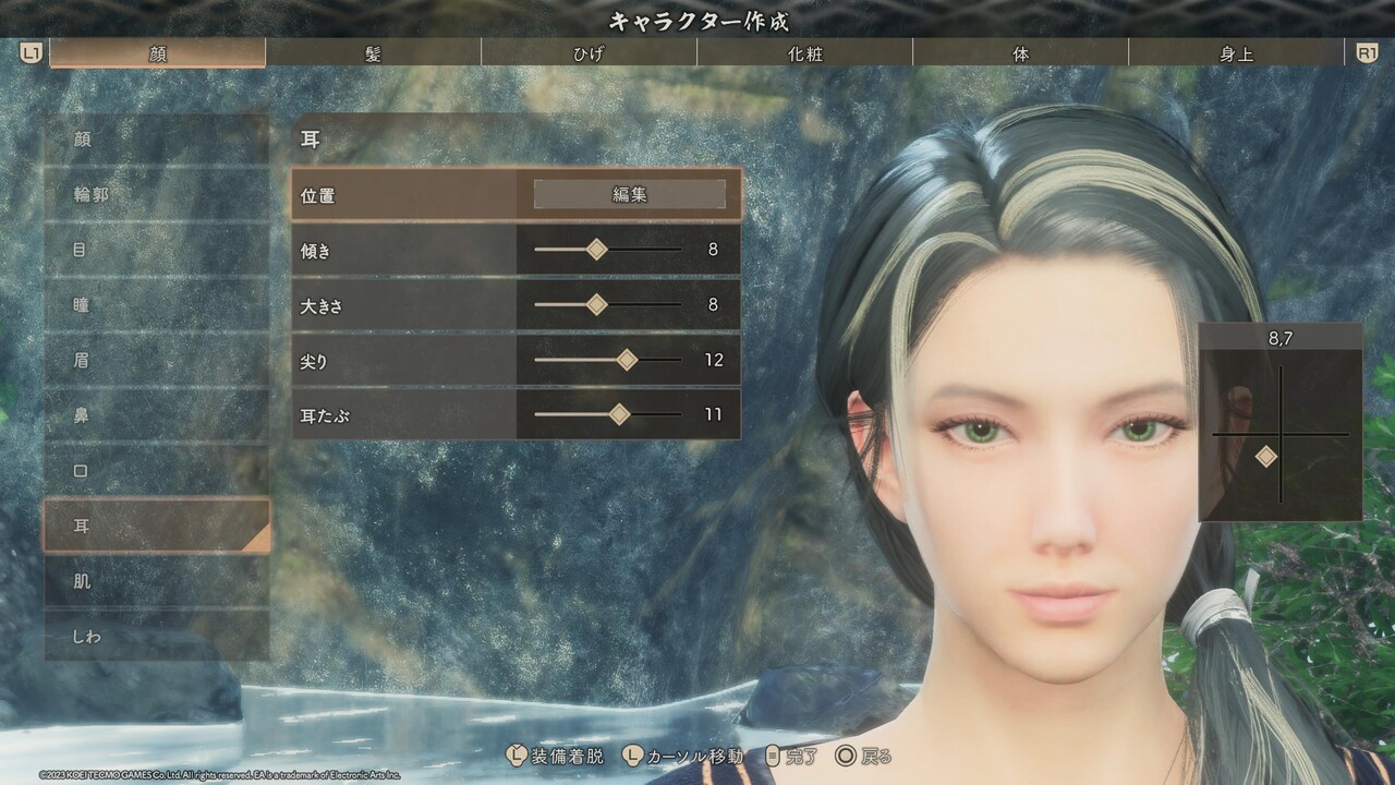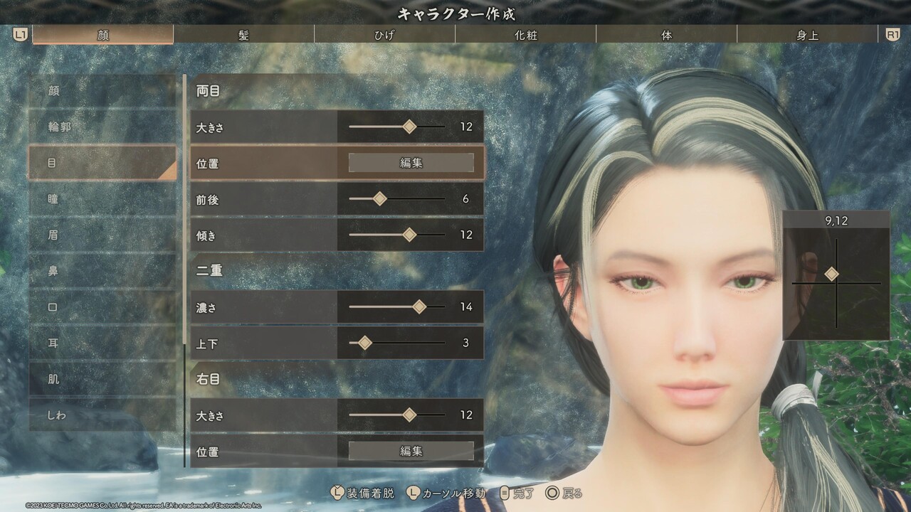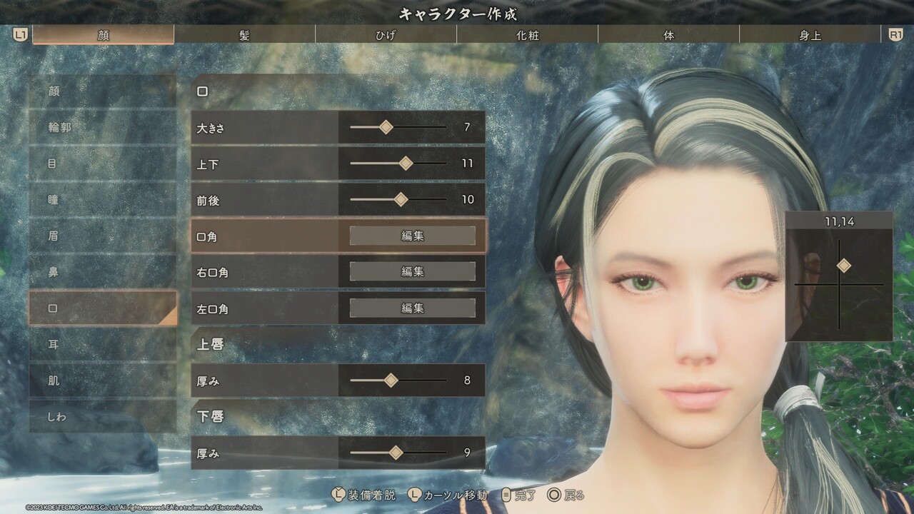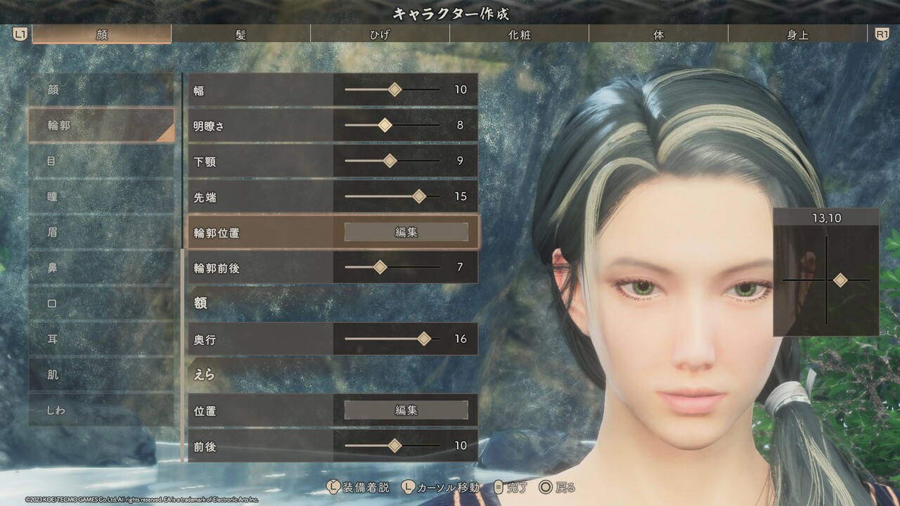 ※輪郭、目、鼻、口、耳のパーツ選択は、特別に表記が無い場合はどれも選ばずに、直接[詳細編集]を設定する。また、目と眉、口の項目にある[右目/左目] [右眉/左眉] [右口角/左口角] は左右別々に位置や形を変えるためのものであるため、顔つきを左右非対称にアレンジしたいとき以外、触れる必要はない。