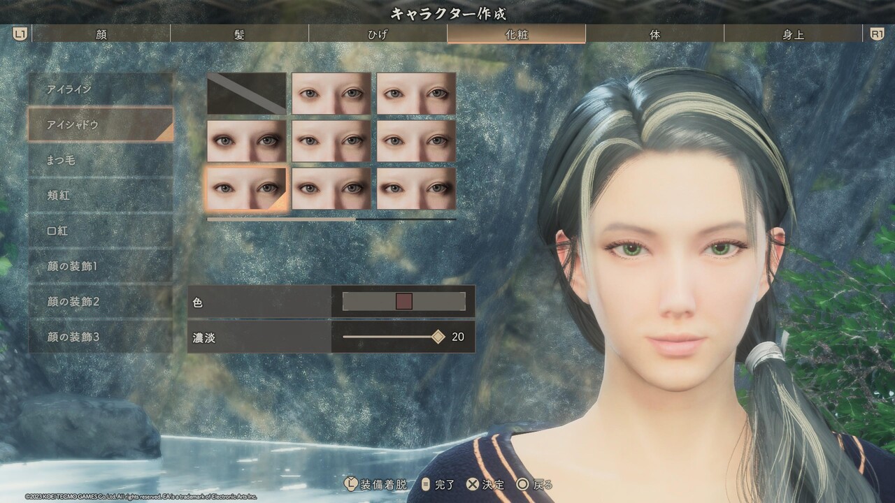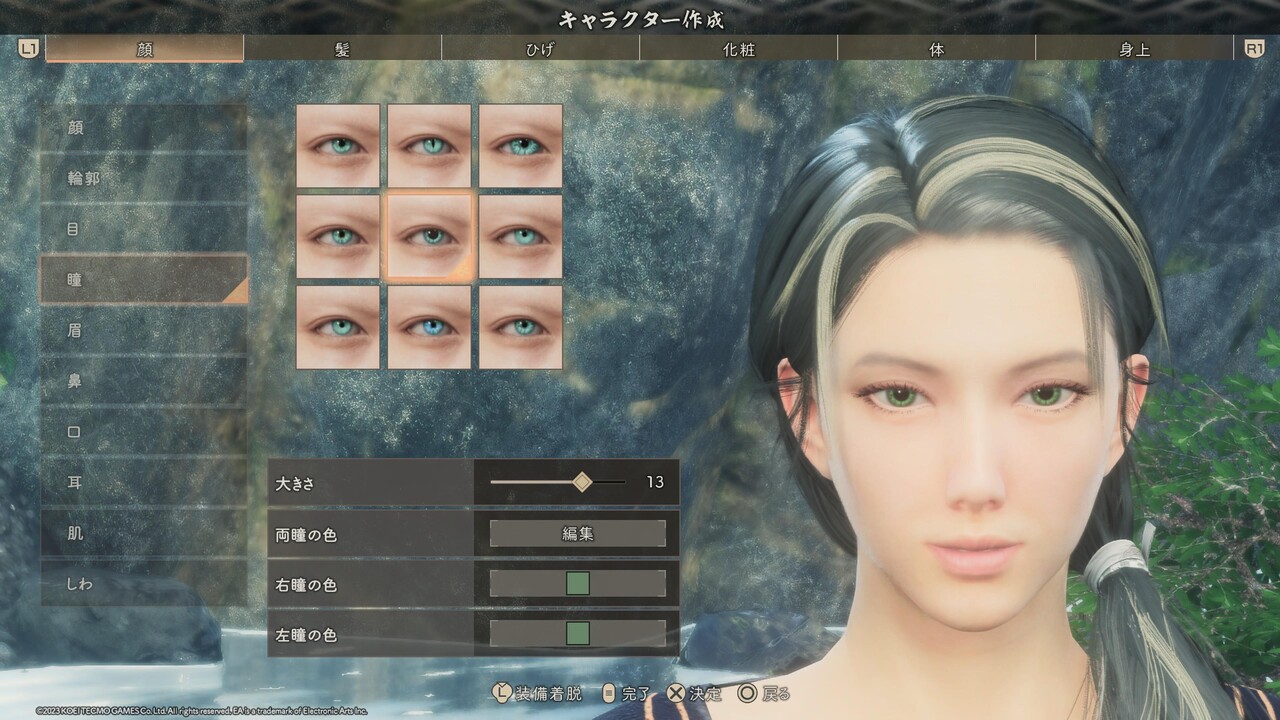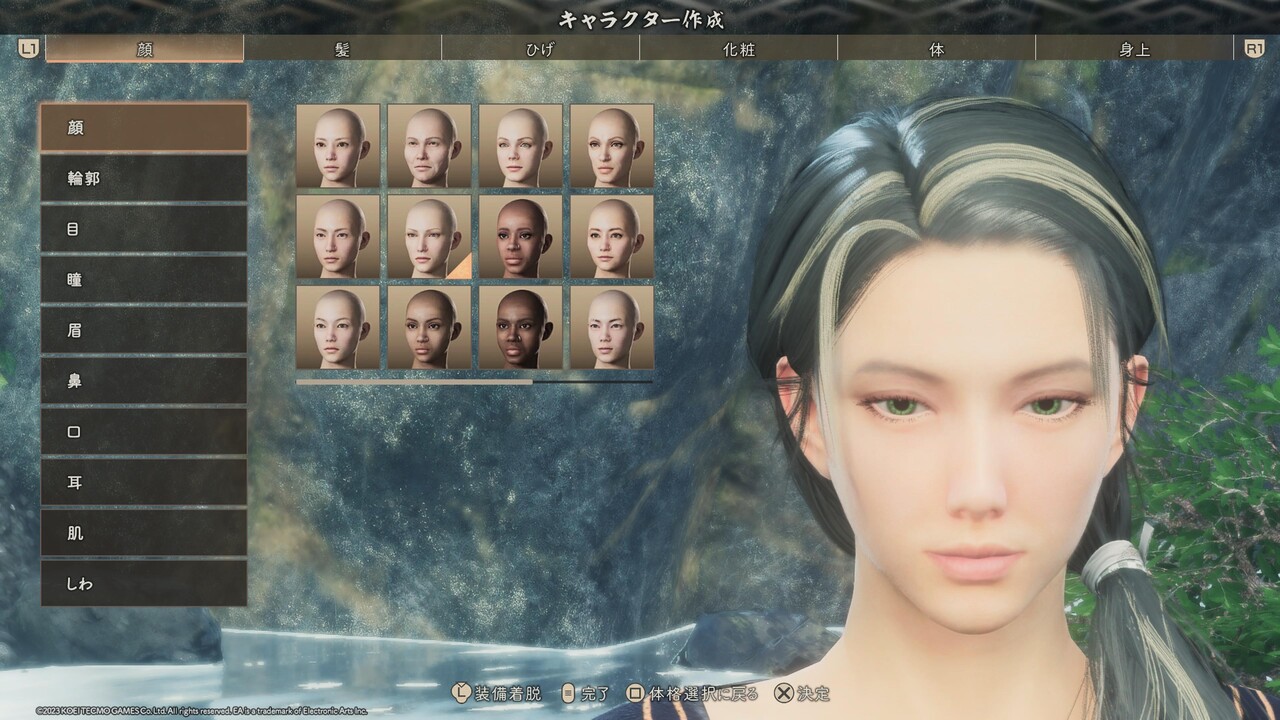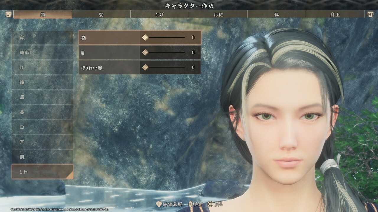 ※輪郭、目、鼻、口、耳のパーツ選択は、特別に表記が無い場合はどれも選ばずに、直接[詳細編集]を設定する。また、目と眉、口の項目にある[右目/左目] [右眉/左眉] [右口角/左口角] は左右別々に位置や形を変えるためのものであるため、顔つきを左右非対称にアレンジしたいとき以外、触れる必要はない。