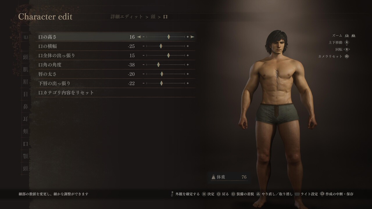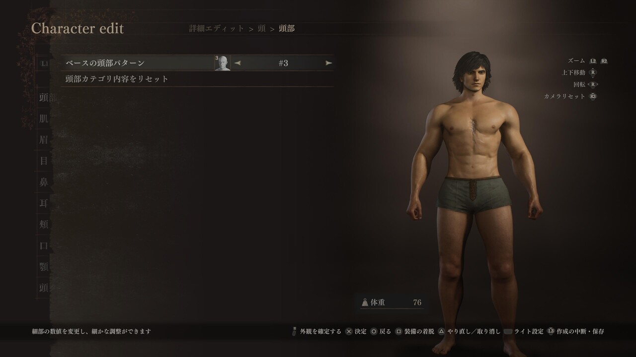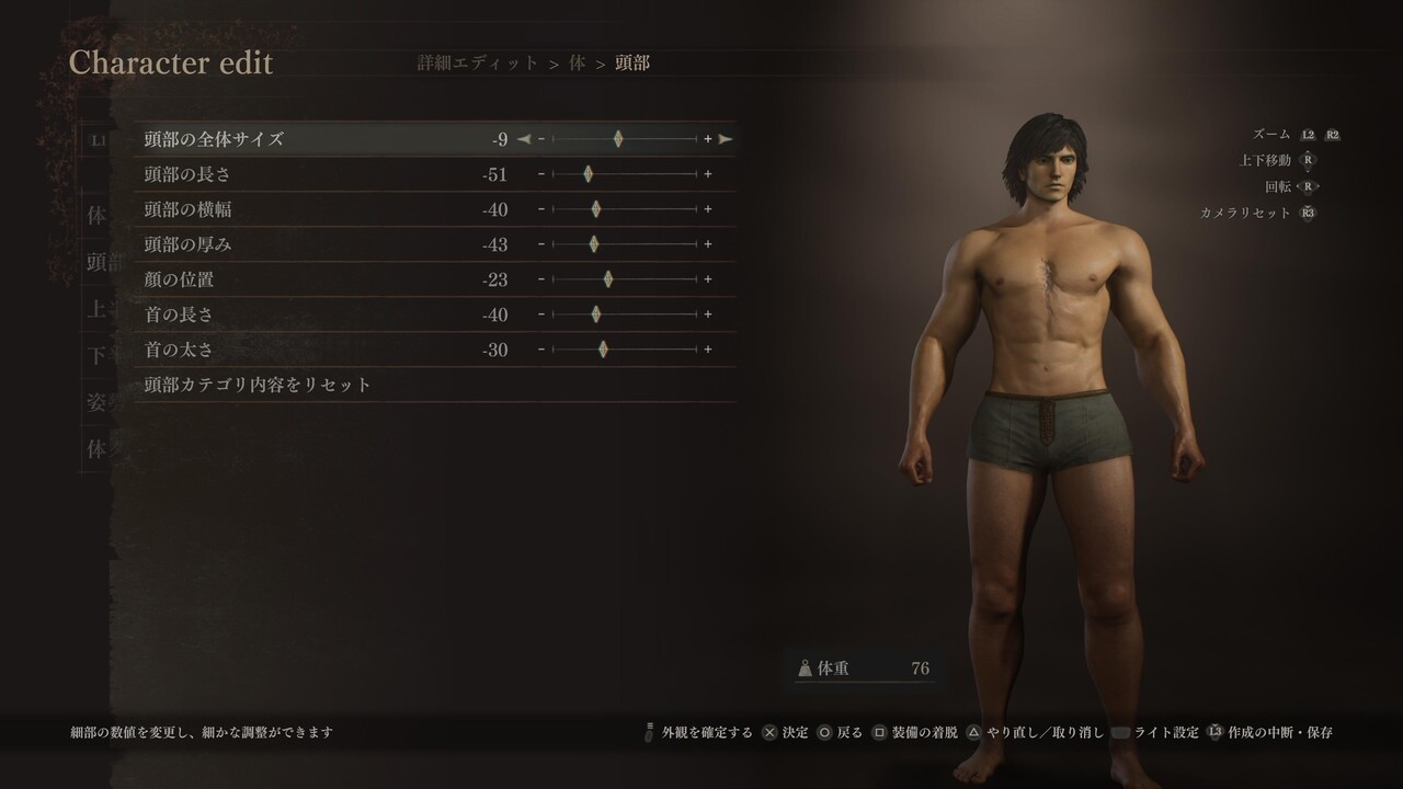 ドラゴンズドグマ2用の男性キャラクターモデル。プレイヤーとポーン、どちらにも使用可能。体、顔ベース設定は詳細エディットによって再現可能な項目であるため設定不要。体(Body)の項目中、頭部(Head)にある[頭部の長さ][頭部の横幅][頭部の厚み][顔の位置]以外の項目は顔の形に影響しないため、首の長さや太さ、体・上半身・下半身・姿勢などの項目は自由に設定したり、他のモデルの体データを使用しても良い。