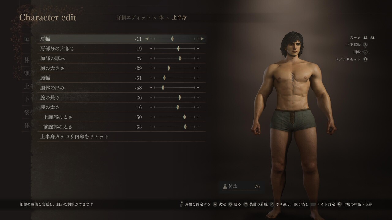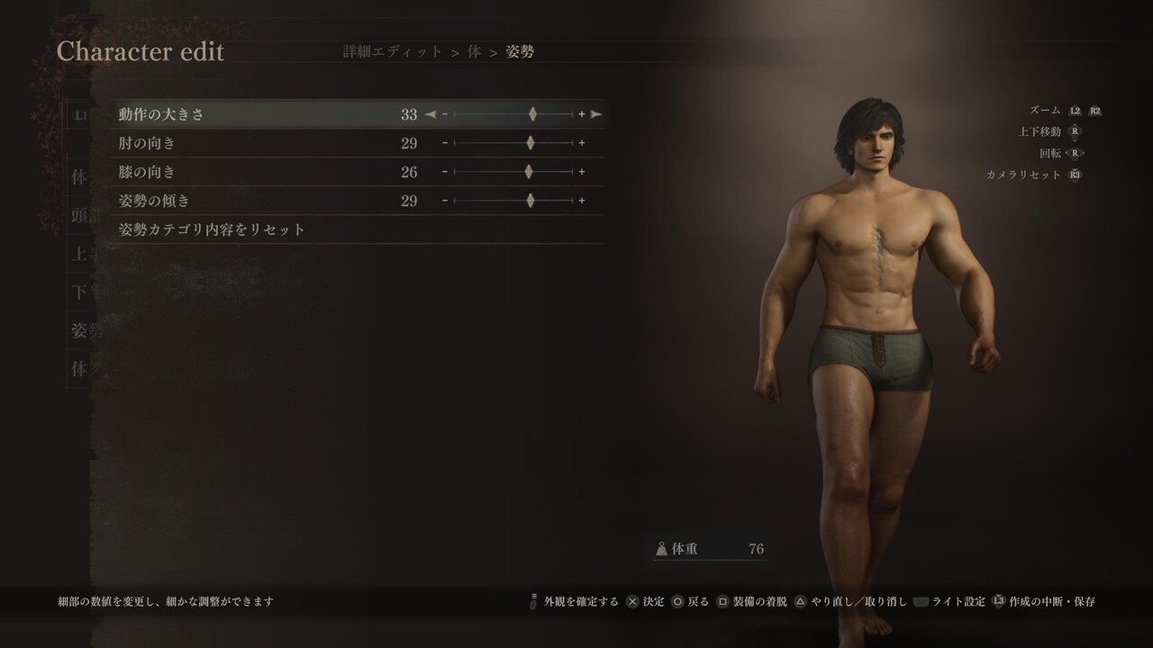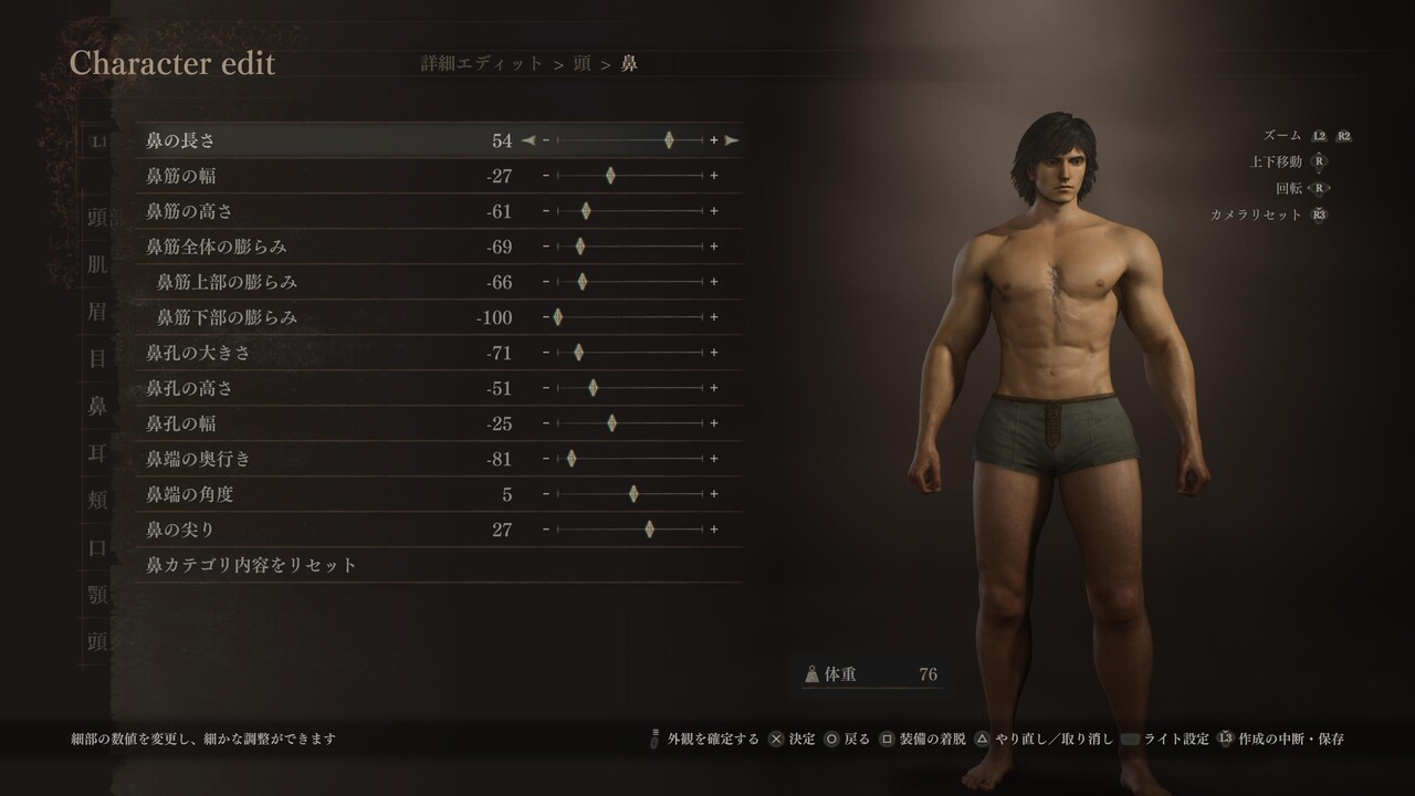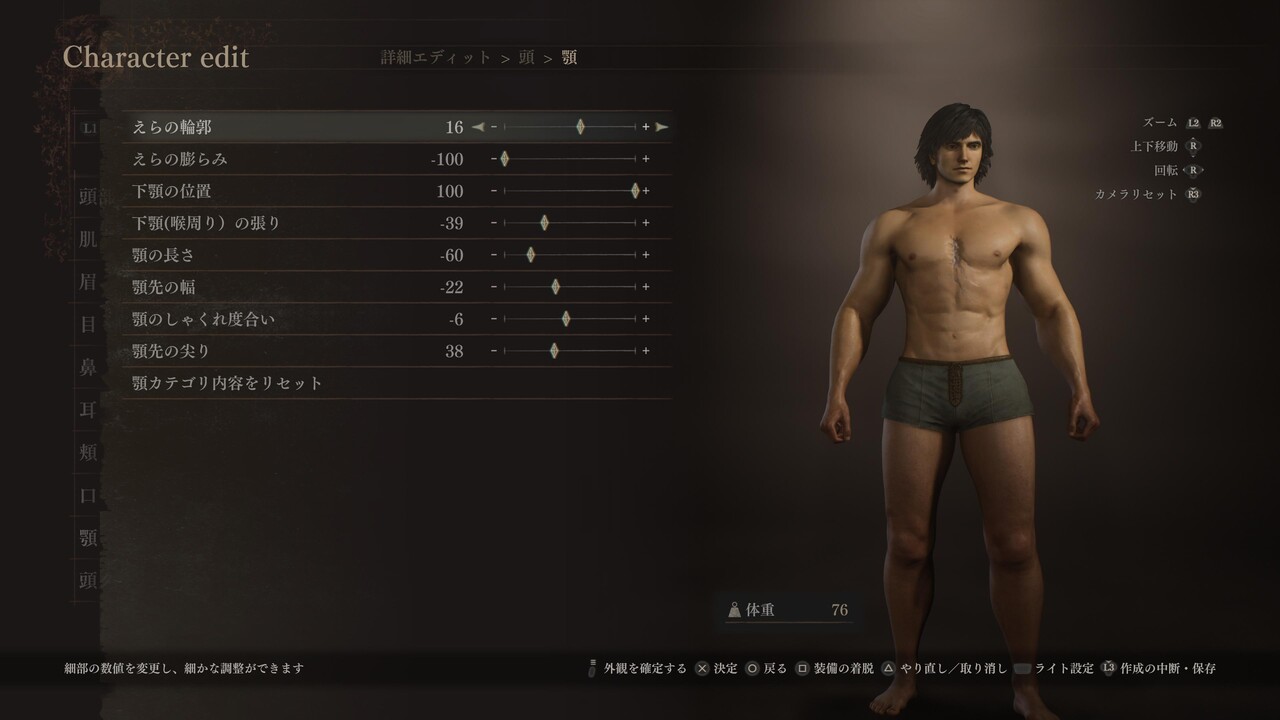 ドラゴンズドグマ2用の男性キャラクターモデル。プレイヤーとポーン、どちらにも使用可能。体、顔ベース設定は詳細エディットによって再現可能な項目であるため設定不要。体(Body)の項目中、頭部(Head)にある[頭部の長さ][頭部の横幅][頭部の厚み][顔の位置]以外の項目は顔の形に影響しないため、首の長さや太さ、体・上半身・下半身・姿勢などの項目は自由に設定したり、他のモデルの体データを使用しても良い。