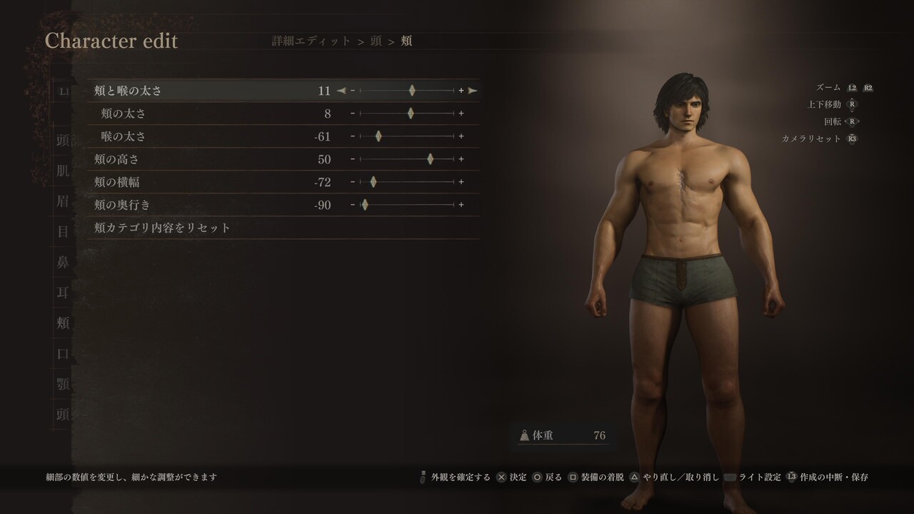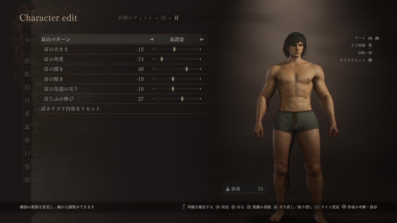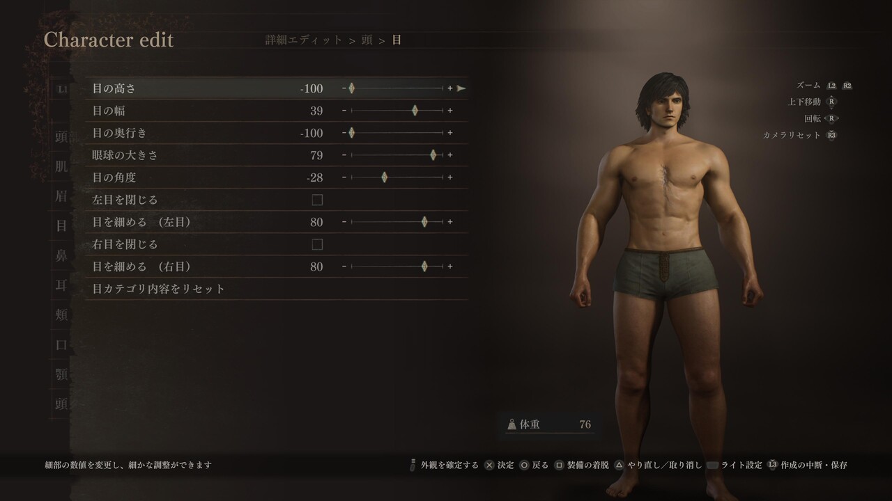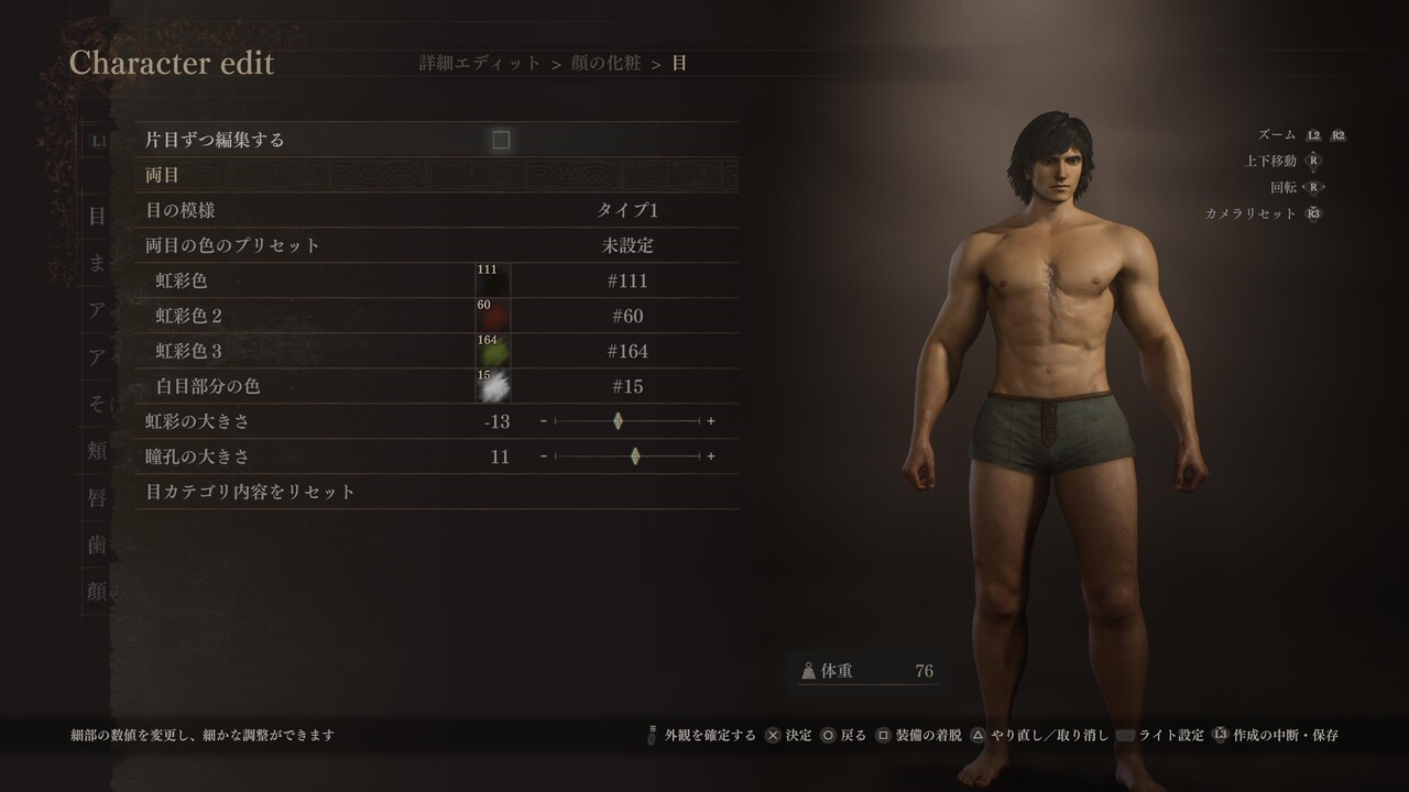 ※髭やアイシャドウ・アイライン・そばかす・頬・唇・歯の項目は、設定していない場合は掲載を省略してある。また体の毛やタトゥ/傷/汚れなども設定せず省略してあるため、好みで設定して良い。